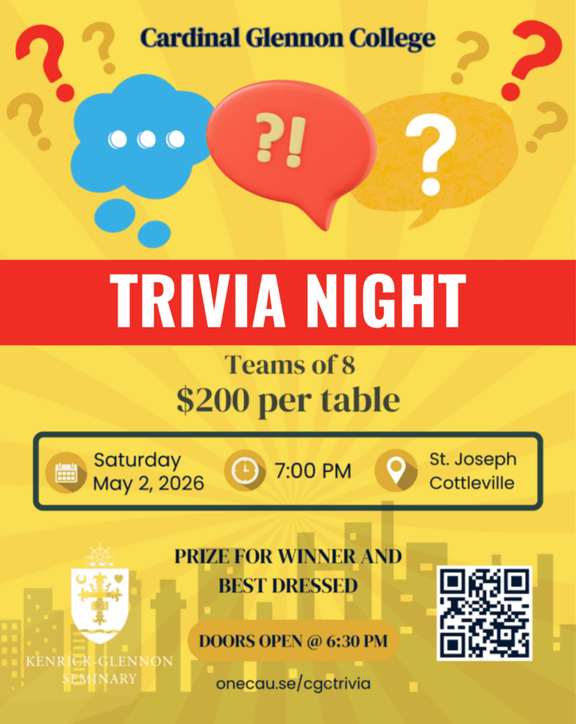 Cardinal Glennon College Trivia NightDate May 2, 2026Time 6:30 pm - 9:30 pmVenue Parish HallLocation 1355 Motherhead Rd., Cottleville 63304 Venue Google Map Link + Google MapEvent Organizer Parish OfficeOrganizer Email parish@stjoecot.org
